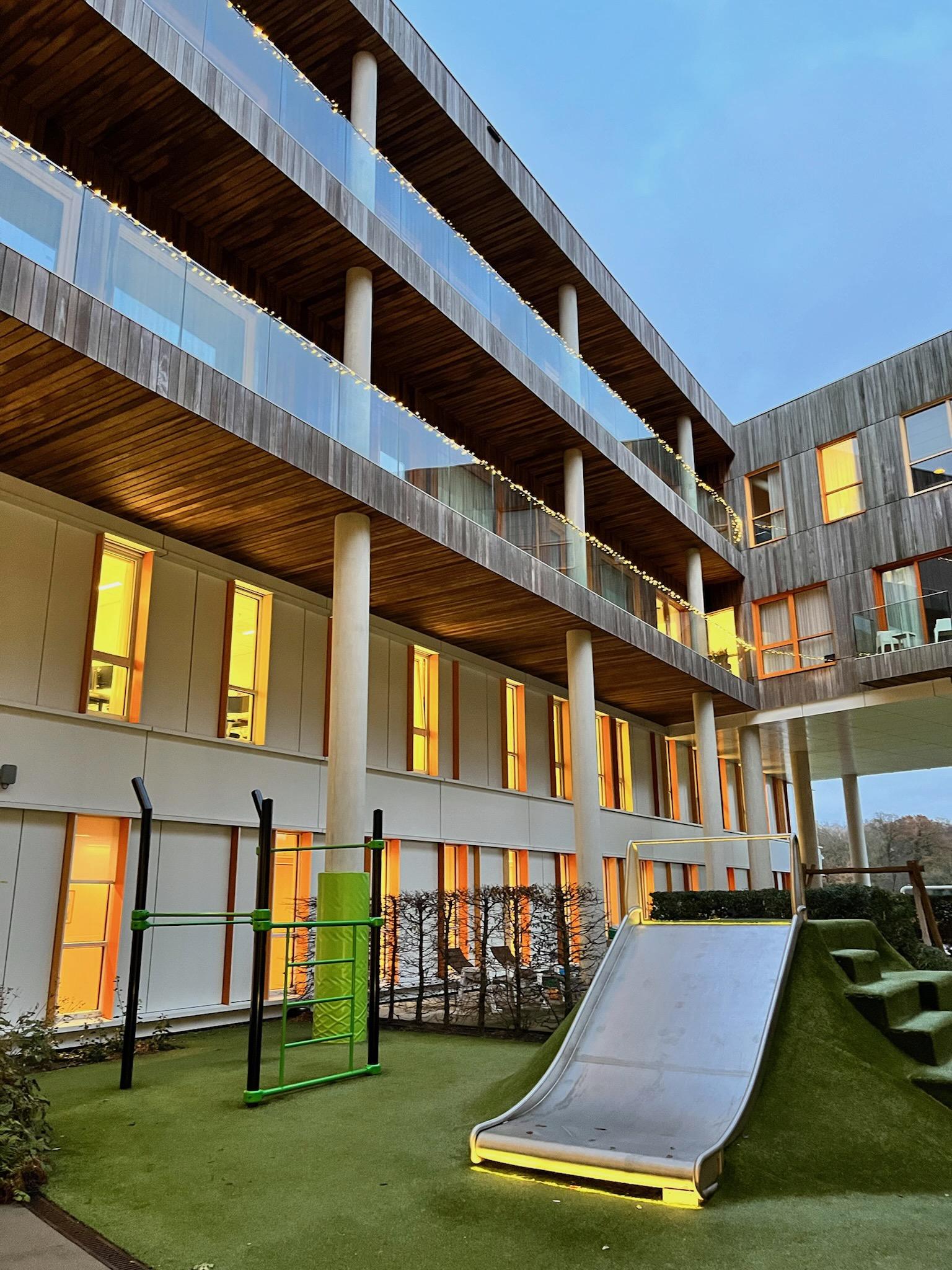 Het hele ziekenhuis werd vanaf het begin mee bedacht door ervaringskundige ouders en 'survivors', en dat merk je. Elke kamer heeft bijvoorbeeld directe toegang tot een terras zodat de kinderen en ouders even naar buiten kunnen zonder door gangen en liften te moeten. De binnenplaatsen zijn optimaal ingericht om te bewegen en te spelen. De refter is een open, uitnodigende ruimte waar gezond en lekker eten geserveerd wordt (maar je kan er ook wel een frietje bestellen). Via een lange, kleurrijke 'slurf' kan je naar het algemene kinderziekenhuis ernaast voor gedeelde operatiezalen.